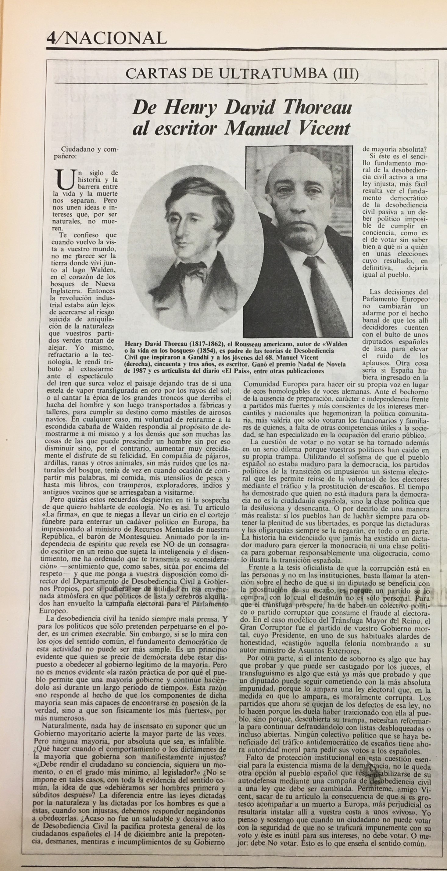 Henry David Thoreau (1817-1862), el Rousseau amcricano, autor dc <Walden 0 la Civil (derecha) cincuenta y tres es cscritor. Ganó el premio Nadal de Novela de 1987 y Cs articulista del <El Paísv, entre otras publicaciones que