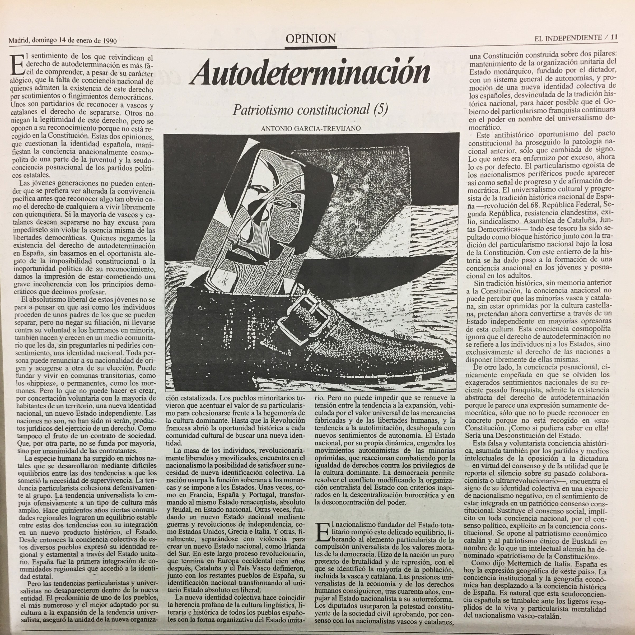 Sin tradición histórica, sin memoria anterior a la Constitución, la conciencia anacional no puede percibir que las minorías vasca y catala na, sin estar oprimidas por la cultura castella na, pretendan ahora convertirse a través de un Estado independiente en mayorías opresoras de esta cultura. Esta conciencia cosmopolita ignora que el derecho de autodeterminación no se refiere a los individuos ni a los Estados, sino exclusivamente al derecho de las naciones a disponer libremente de ellas mismas.