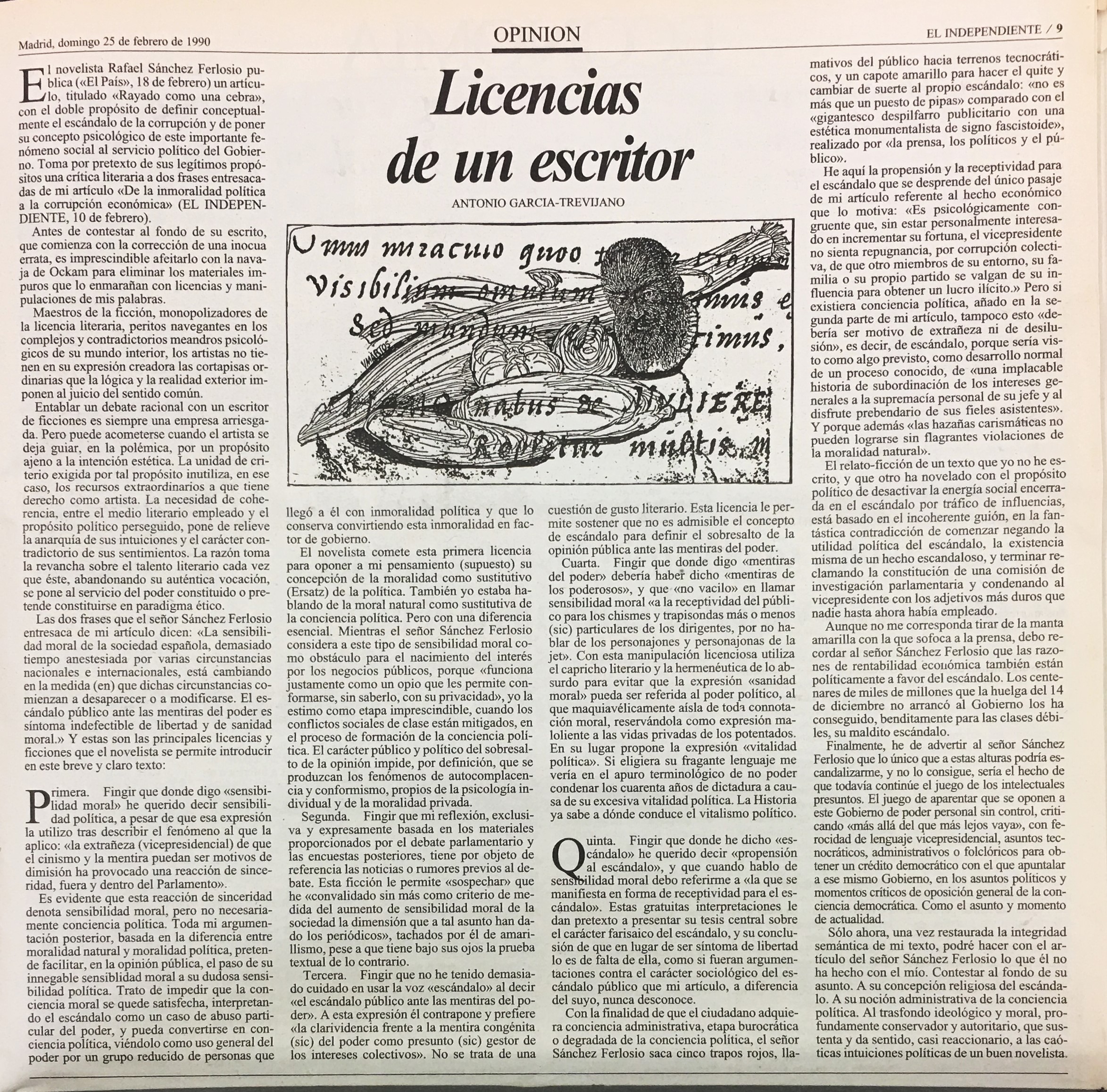 novelista Rafael Sánchez Ferlosio puE lo, titulado <Rayado como una cebray, con el doble propósito de definir conceptual mente el escándalo de la corrupción y de poner su concepto psicológico de este importante fenómeno social al servicio político del Gobier no. Toma por pretexto de sus legítimos propó sitos una crítica literaria a dos frases entresaca das de mi artículo <De la inmoralidad política a la corrupción económica) (EL INDEPENDIENTE, 10 de febrero)