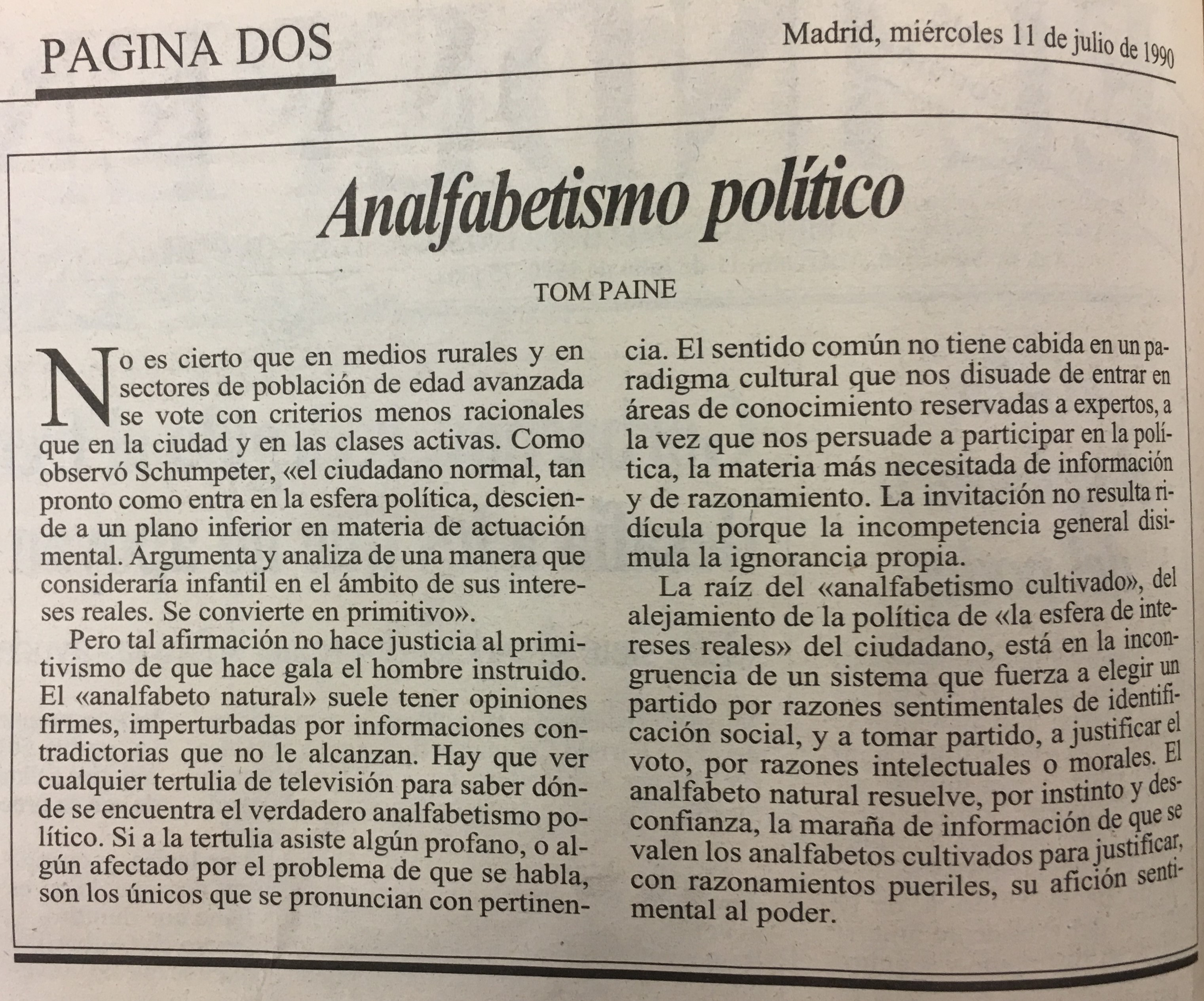 Pero tal afirmación no hace justicia al primi tivismo de que hace el hombre instruido. El <analfabeto naturaly suele tener opiniones firmes, imperturbadas por informaciones contradictorias que no le alcanzan. que ver cualquier tertulia de televisión para saber dónde se encuentra el verdadero analfabetismo político: Si a la tertulia asiste algún profano, 0 alafectado por el problema de que se son los únicos que se pronuncian con pertinen gala Hay gún habla,