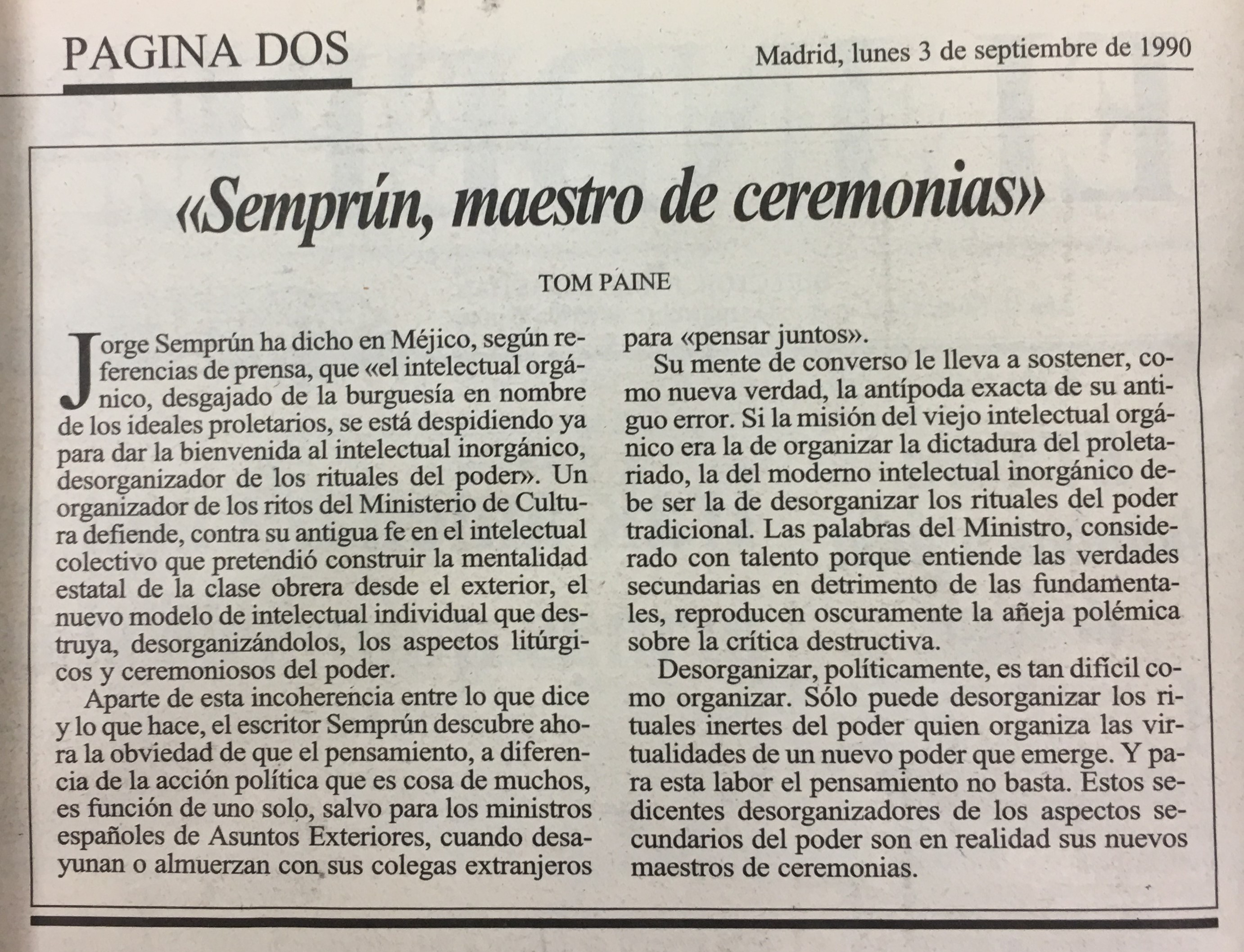 orge Semprún ha dicho en Méjico, según re ferencias de prensa, que <el intelectual nico; desgajado de la burguesía en nombre de los ideales proletarios; se está despidiendo ya para dar la bienvenida al intelectual inorgánico, Un organizador de los ritos del Ministerio de Cultura defiende; contra su antigua fe en el intelectual colectivo que pretendió construir la mentalidad estatal de la clase obrera desde el exterior, el nuevo modelo de intelectual individual que des truya, desorganizándolos, los aspectos litúrgicos y ceremoniosos del orgá- para <pensar juntos).