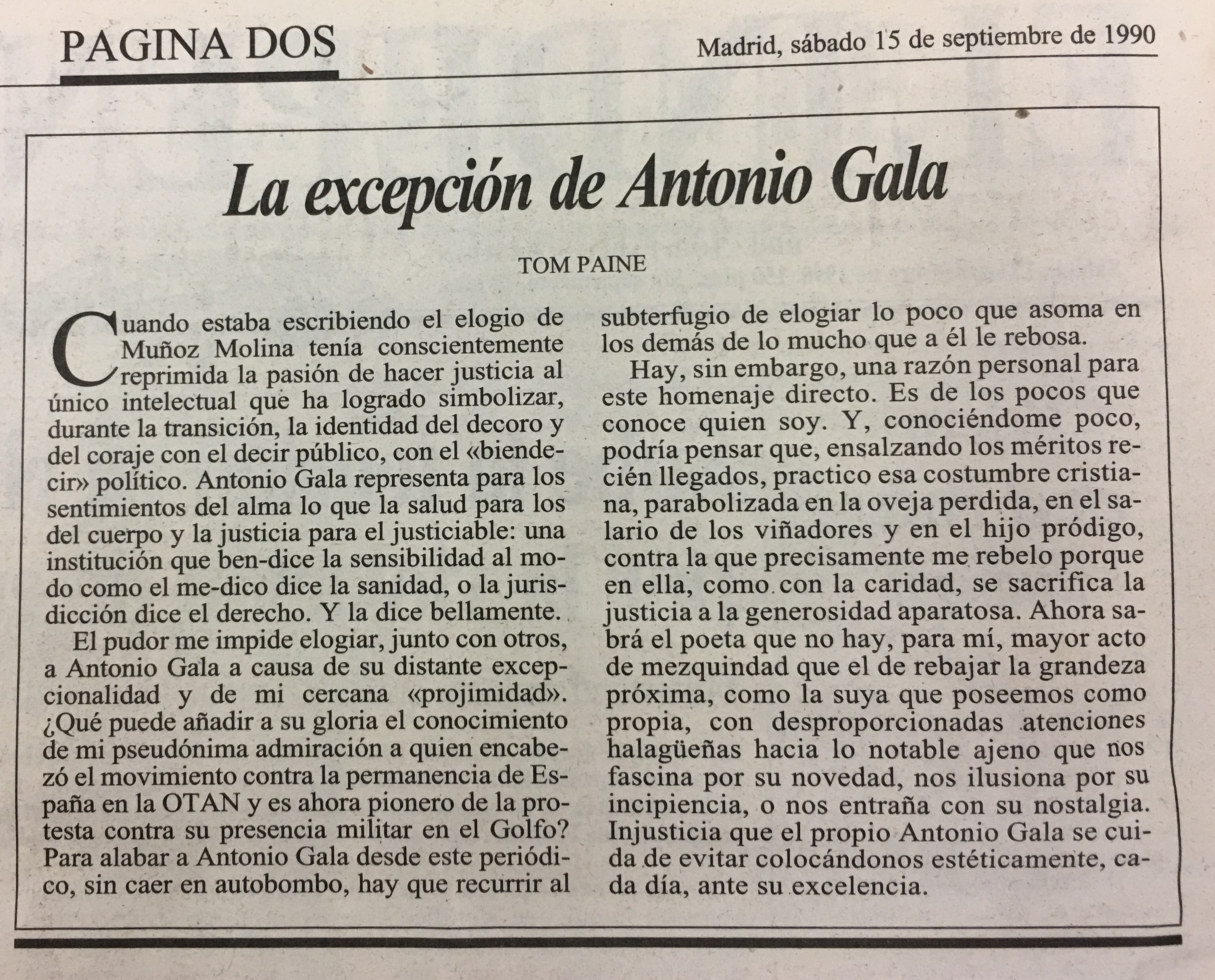 El me impide elogiar, junto con otros, a Antonio Gala a causa de su distante excepcionalidad y de mi cercana ;Qué puede añadir a su gloria el conocimiento de mi pseudónima admiración a quien encabezó elmovimiento contra la permanencia de Esen la OTAN y es ahora pionero de la protesta contra sU presencia militar en el Golfo? Para alabar a Antonio Gala desde este periódi co; sin caer en autobombo, que recurrir al pudor paña hay sin embargo, una razón personal para este homenaje directo. Es de los pocos que conoce quien soy. Y conociéndome poco, podría pensar que, ensalzando los méritos recién llegados; practico esa costumbre cristia na, parabolizada en la oveja perdida, en el salario de los viñadores y en el hijo pródigo, contra la que precisamente me rebelo porque en ella, como con la caridad, se sacrifica la justicia a la generosidad aparatosa. Ahora sabrá el poeta que no para mí, mayor acto de mezquindad que el de rebajar la grandeza próxima, como la suya que poseemos como propia, con desproporcionadas atenciones halagüeñas hacia lo notable ajeno nos fascina por su novedad, nos ilusiona por su incipiencia, 0 nos entraña con su nostalgia: Injusticia que el propio Antonio Gala se da de evitar colocándonos estéticamente, cada ante su excelencia. Hay, hay = que cuidía,