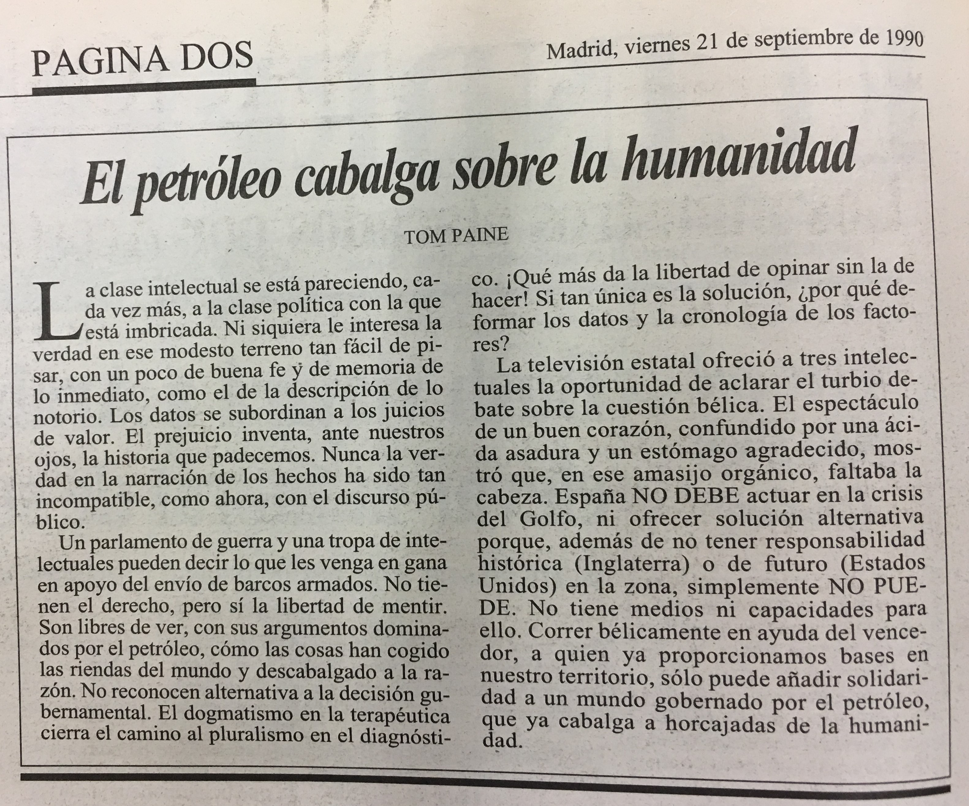 tres intelec La televisión estatal ofreció a tuales la oportunidad de aclarar el turbio debate sobre la cuestión bélica: El espectáculo de un buen corazón, confundido por una ácida asadura y un estómago agradecido, mos tró que, en ese amasijo orgánico, faltaba la cabeza. España NO DEBE actuar en la crisis del Golfo, ni ofrecer solución alternativa porque, además de no tener responsabilidad histórica (Inglaterra) de futuro (Estados Unidos) DE. No tiene medios ni capacidades para ello. Correr bélicamente en ayuda del vencea quien ya proporcionamos bases en nuestro territorio, sól0 puede añadir solidari dad a un mundo gobernado el petróleo, que ya cabalga a dad. dor,
