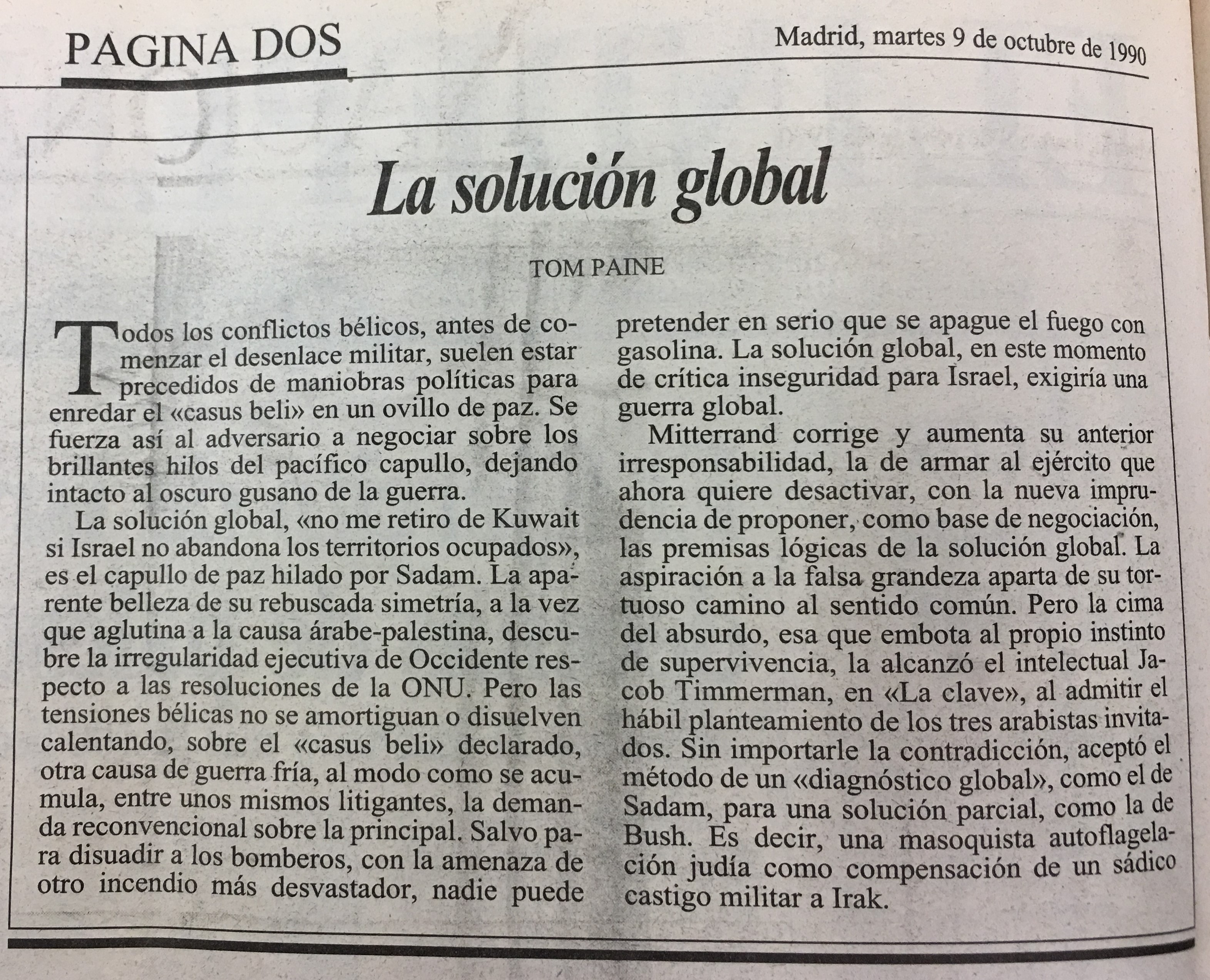 Mitterrand corrige y aumenta su anterior irresponsabilidad, la de armar al ejército que ahora quiere desactivar, con la nueva imprudencia de proponer,como base de negociación; las premisas lógicas de la solución La aspiración a la falsa grandeza aparta de su tortuoso camino al sentido común. Pero la cima del absurdo, esa que embota al propio instinto de supervivencia, la alcanzó el intelectual Jacob Timmerman, en <La claves, al admitir el hábil planteamiento de los tres arabistas invitados. Sin importarle la contradicción, el método de un <diagnóstico global, como el de Sadam, 9 para una solución parcial, como la de Bush. Es decir; una masoquista autoflagelación judía como compensación de un sádico castigo militar a Irak. global. aceptó