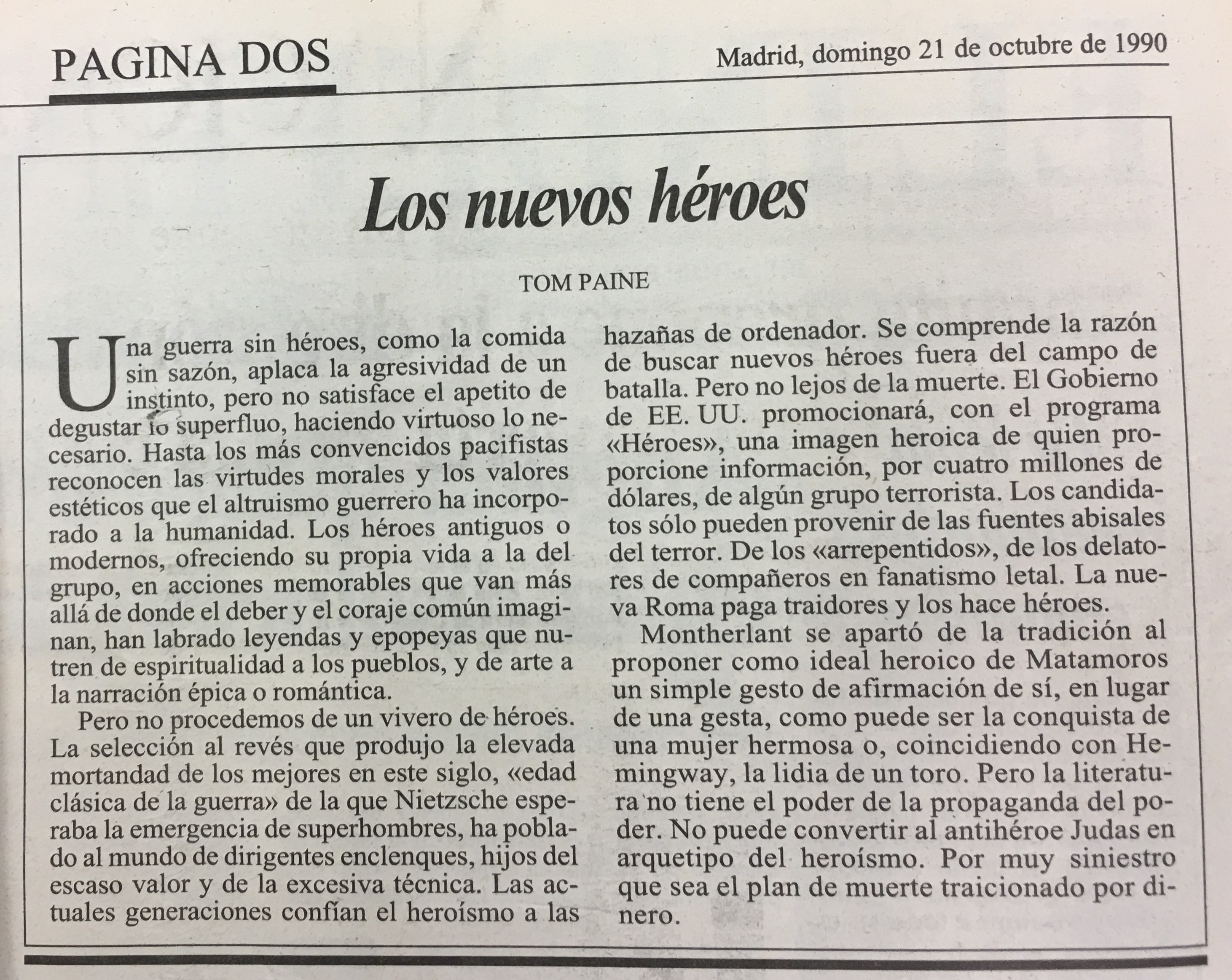 sin héroes, como la comida U na sazón, la agresividad de un sin satisface el de degustar 1o y los valores rado a la humanidad. Los héroes . antiguos modernos, ofreciendo su vida a la del grupo, en acciones memorables que van más allá de donde el deber y el coraje común imagi nan, han labrado leyendas y epopeyas que nutren de espiritualidad a los pueblos, y de arte a la narración épica 0 romántica. guerra aplaca apetito propia hazañas de ordenador. Se comprende la razón de buscar nuevos héroes fuera del campo de batalla. Pero no lejos de la muerte. El Gobierno de EE UU. promocionará, con el programa <Héroes) 2 una imagen heroica de quien proporcione informacion, por cuatro millones de dólares, de algún grupo terrorista. Los candida tos sól0 pueden provenir de las fuentes abisales del terror. De los <arrepentidosy, de los delatores de compañeros en fanatismo letal: La nueva Roma paga traidores y los hace héroes;