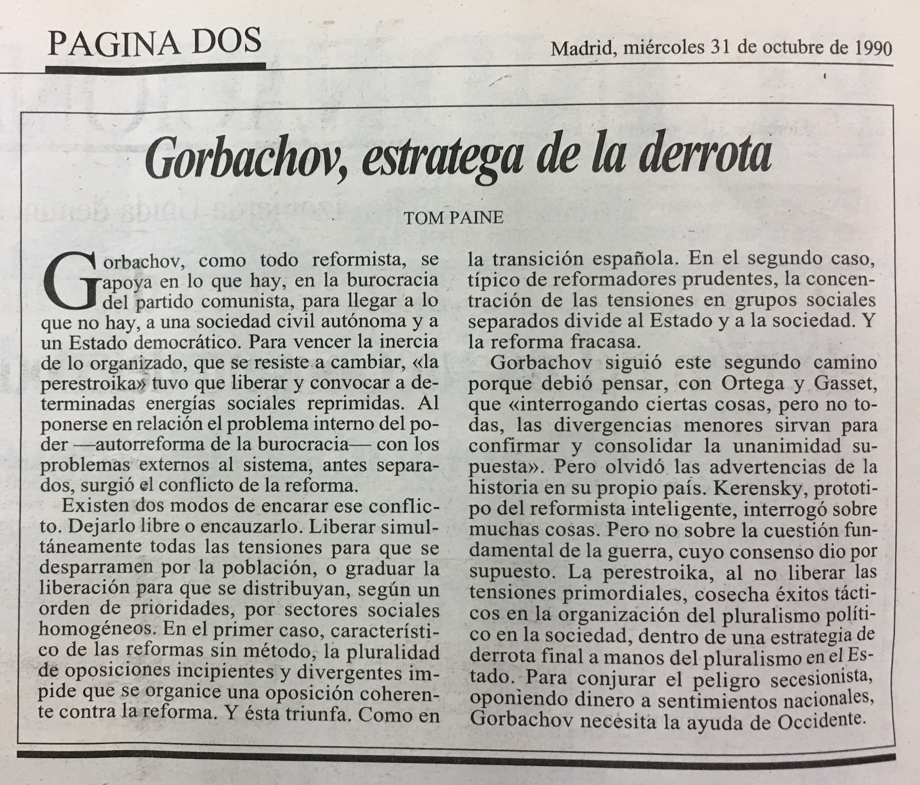 Gorbachov siguió este segundo camino porque debió pensar, con Ortega y Gasset, que <interrogando ciertas cosas, pero no todas, las divergencias menores sirvan para confirmar y consolidar la unanimidad puesta) . Pero olvidó las advertencias de la historia en su propio Kerensky, 9 prototi po del reformista inteligente, interrogó sobre muchas cosas. Pero no sobre la cuestión fundamental de la guerra, cuyo consenso dio por supuesto. La perestroika, al no liberar las tensiones primordiales, cosecha éxitos tácticos en la organización del pluralismo co en la sociedad, dentro de una estrategia de derrota final a manos del pluralismo en el Estado. Para conjurar el peligro secesionista, oponiendo dinero a sentimientos nacionales, Gorbachov necesita 1a ayuda de Occidente: país . políti-