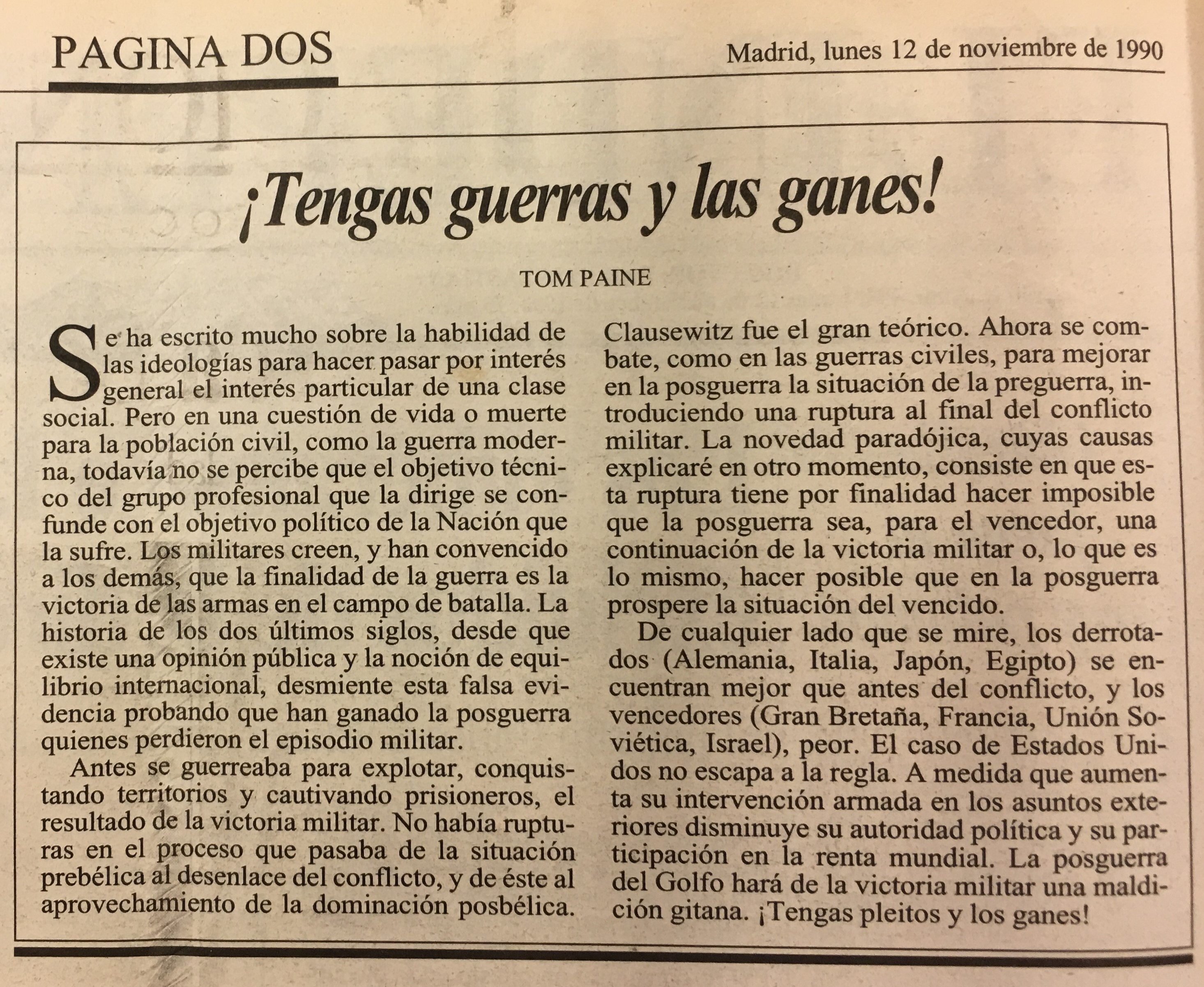 De cualquier lado que se mire, los derrotados (Alemania, Italia, Japón; Egipto) se encuentran mejor que antes del conflicto; y los vencedores (Gran Bretaña, Francia, Unión Soviética, Israel), peor. El caso de Estados Uni dos no escapa a la regla. A medida que aumen ta su intervención armada en los asuntos exteriores disminuye su autoridad política y su par ticipación en la renta mundial. La posguerra del Golfo hará de la victoria militar una maldi ción gitana. iTengas pleitos y los ganes!