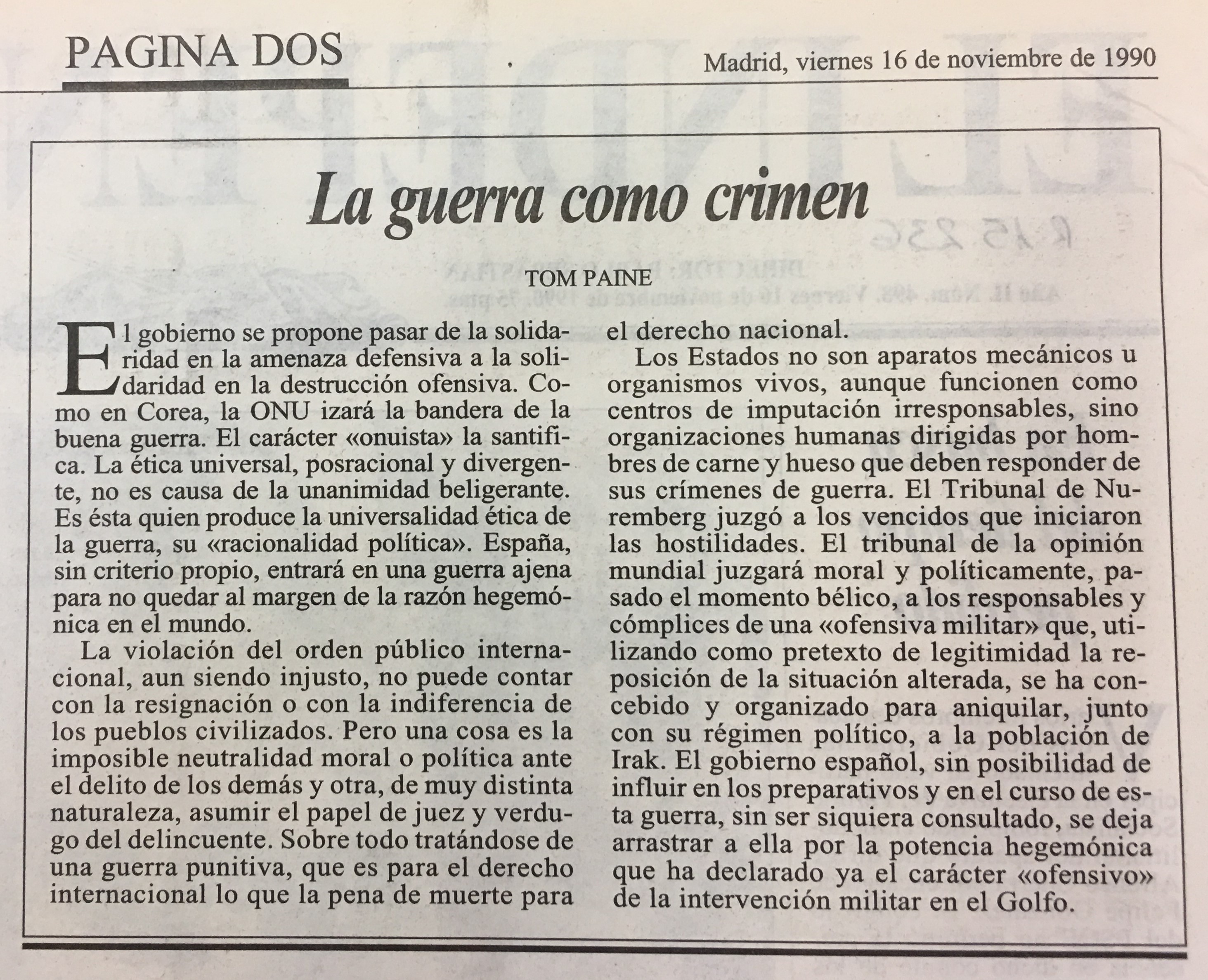 Los Estados no son aparatos mecánicos u como centros de imputación irresponsables,, sino organizaciones humanas dirigidas por hombres de carne y hueso que deben responder de sus crímenes de guerra. El Tribunal de Nuremberg juzgó a los vencidos que iniciaron las hostilidades . El tribunal de la opinión mundial juzgará moral y políticamente pa sado el momento bélico; a los responsables y cómplices de una <ofensiva militar) que, utilizando como pretexto de legitimidad la reposición de la situación alterada, se ha con cebido y organizado . para aniquilar, junto con su régimen político, a la población de Irak. El gobierno español, sin posibilidad de influir en los preparativos y en el curso de es ta guerra, sin ser siquiera consultado, se deja arrastrar a ella por la potencia hegemónica de la intervención militar en el Golfo.