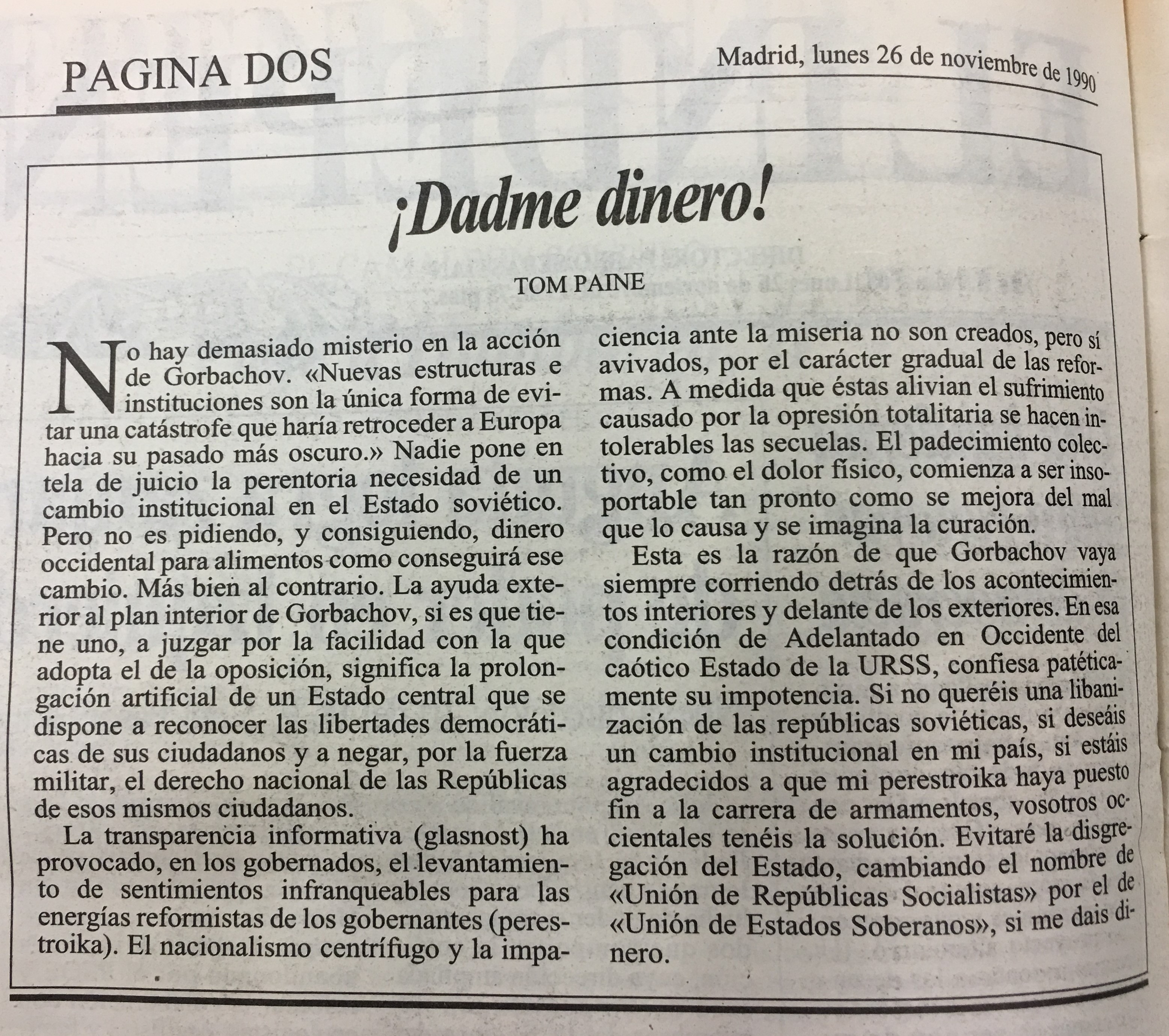 Esta es la razón de que Gorbachov vaya siempre corriendo detrás de los acontecimientos interiores y delante de los exteriores. En esa condición de Adelantado en Occidente del caótico Estado de la URSS , confiesa mente su impotencia: Si no queréis una libanización de las repúblicas soviéticas; si deseáis un cambio institucional en mi país; si estáis agradecidos a que mi perestroika haya fin a la carrera cientales tenéis la solución. Evitaré la disgre gación del Estado, cambiando el de kUnión de Estados Soberanosv, si me dais di: nero. patéticapuesto nombre por