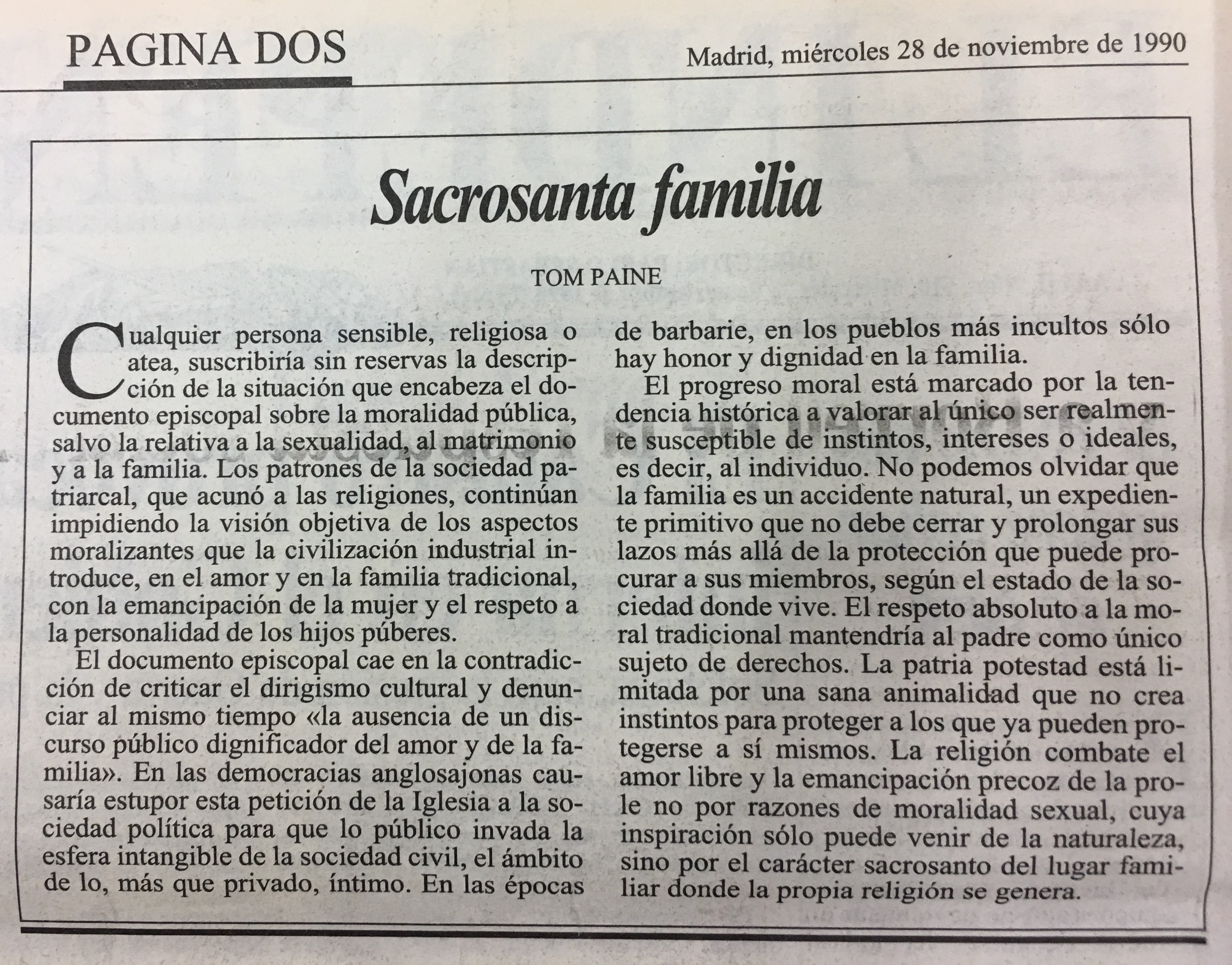 ualquier persona sensible, religiosa 0 atea, suscribiría sin reservas la descrip ción de la situación que encabeza el documento episcopal sobre la moralidad pública, salvo la relativa a la sexualidad, al matrimonio y a la familia. Los patrones de la sociedad patriarcal, que acunó a las religiones, continúan impidiendo la visión objetiva de los aspectos moralizantes que la civilización industrial introduce, en el amor y en la familia tradicional, con la emancipación de la mujer y el respeto a la personalidad de los hijos púberes.