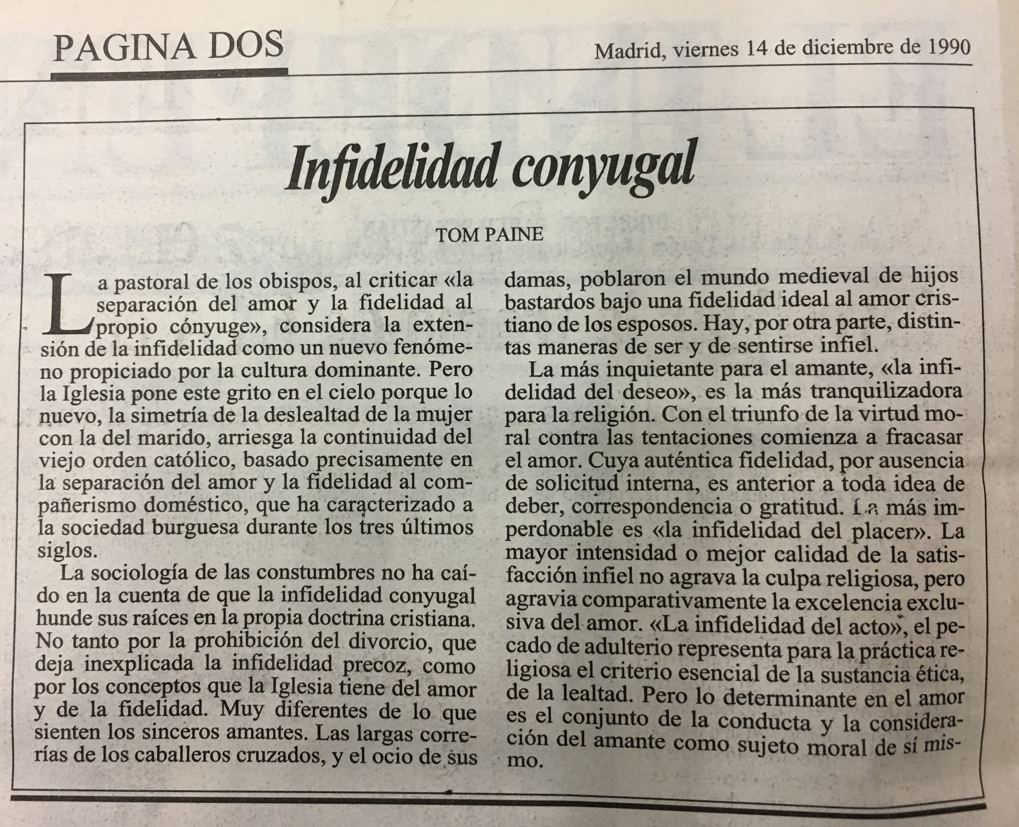 a pastoral de los obispos; al criticar <la L separación del amor y la fidelidad al 'propio_cónyugey, considera la exten sión de la infidelidad como un nuevo fenómeno propiciado por la cultura dominante. Pero la Iglesia pone este en el cielo porque lo nuevo, la simetría de la deslealtad de la mujer con la del marido, arriesga la continuidad del viejo orden católico; basado precisamente en la separación del amor y la fidelidad al compañerismo doméstico; que ha caracterizado a la sociedad burguesa durante los tres últimos siglos. grito damas; poblaron el mundo medieval de hijos bastardos bajo una fidelidad ideal al amor cristiano de los esposos. por otra parte, distin tas maneras de ser y de sentirse infiel. Hay,