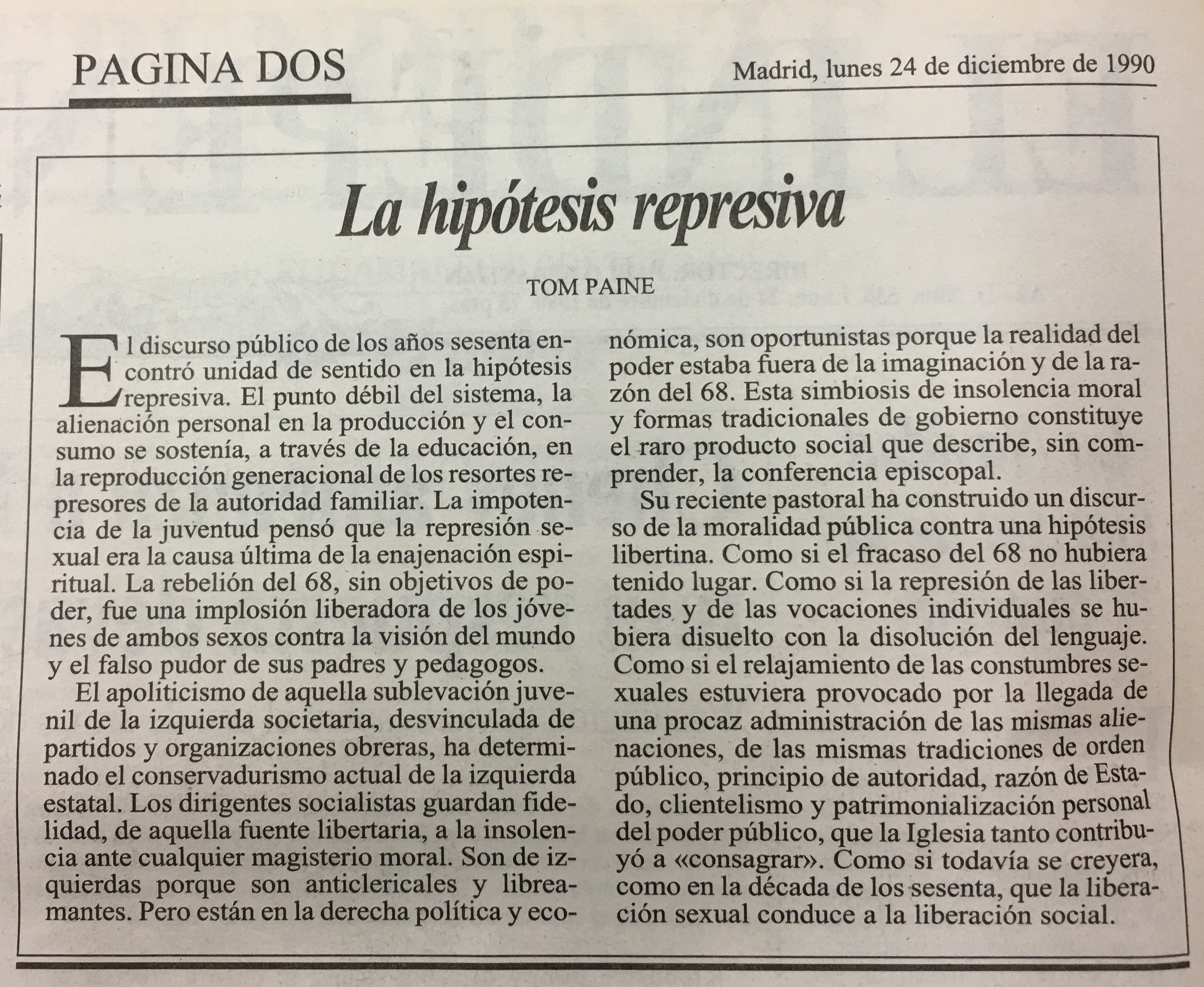 Su reciente pastoral ha construido un discur so de la moralidad pública contra una hipótesis libertina. Como si el fracaso del 68 no hubiera tenido lugar: Como si la represión de las liber tades y de las vocaciones individuales se hubiera disuelto con la disolución del lenguaje. Como si el relajamiento de las constumbres sexuales estuviera provocado por la llegada de una procaz administración de las mismas alienaciones, de las mismas tradiciones de orden público, principio de autoridad, razón de Estado; clientelismo y patrimonialización personal del poder público; que la Iglesia tanto contribuyó a <consagrar)) _ Como si todavía se creyera, como en la década de los sesenta, que la liberación sexual conduce a la liberación social.