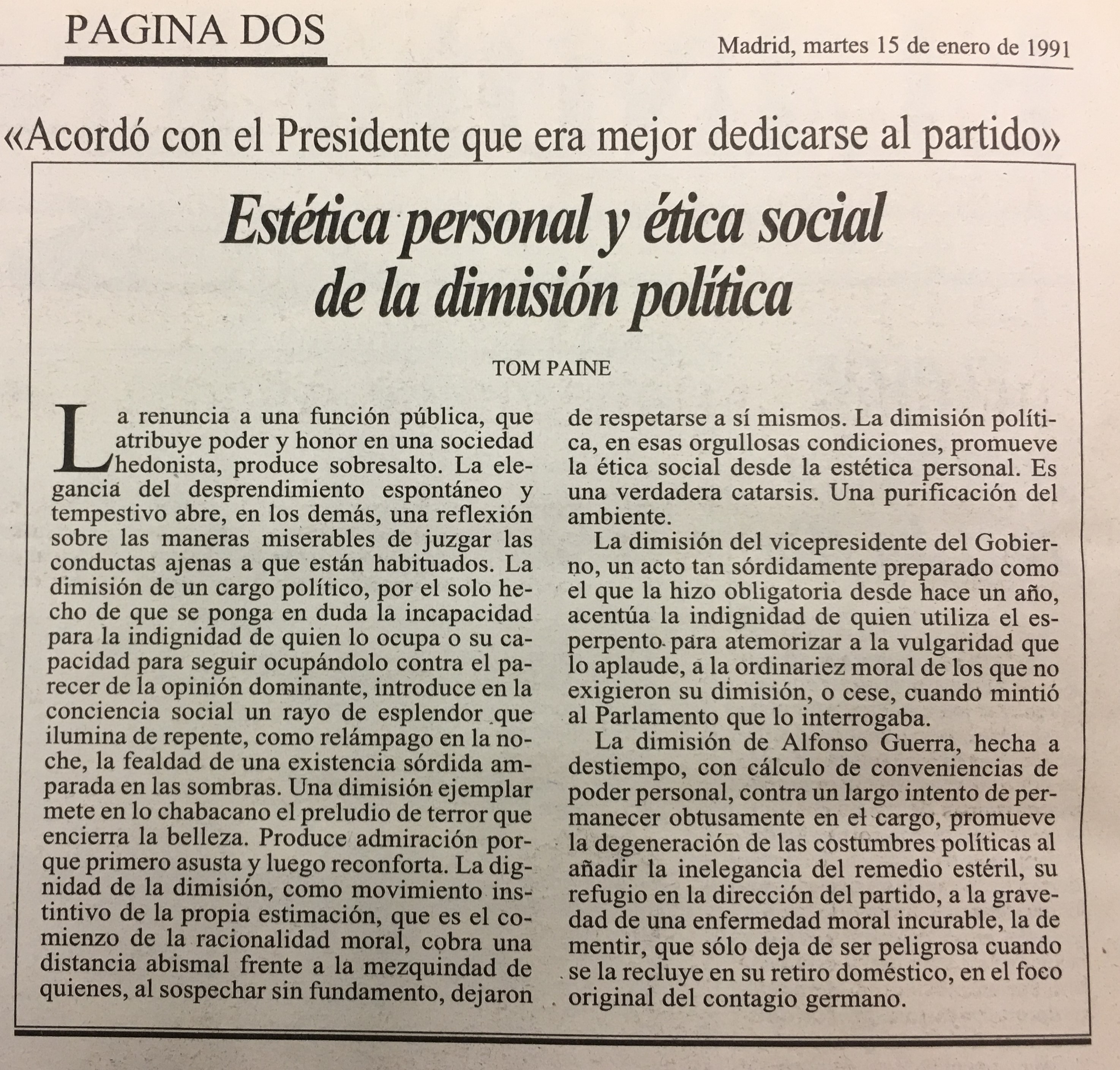 La dimisión de Alfonso Guerra, hecha a destiempo; con cálculo de conveniencias de poder personal, contra un largo intento de per manecer obtusamente en el cargo, promueve la degeneración de las costumbres políticas al añadir la inelegancia del remedio estéril, su refugio en la dirección del partido, a la gravedad de una enfermedad moral incurable, la de mentir, que sól0 deja de ser peligrosa cuando se la recluye en su retiro doméstico; en el foco original del contagio germano.