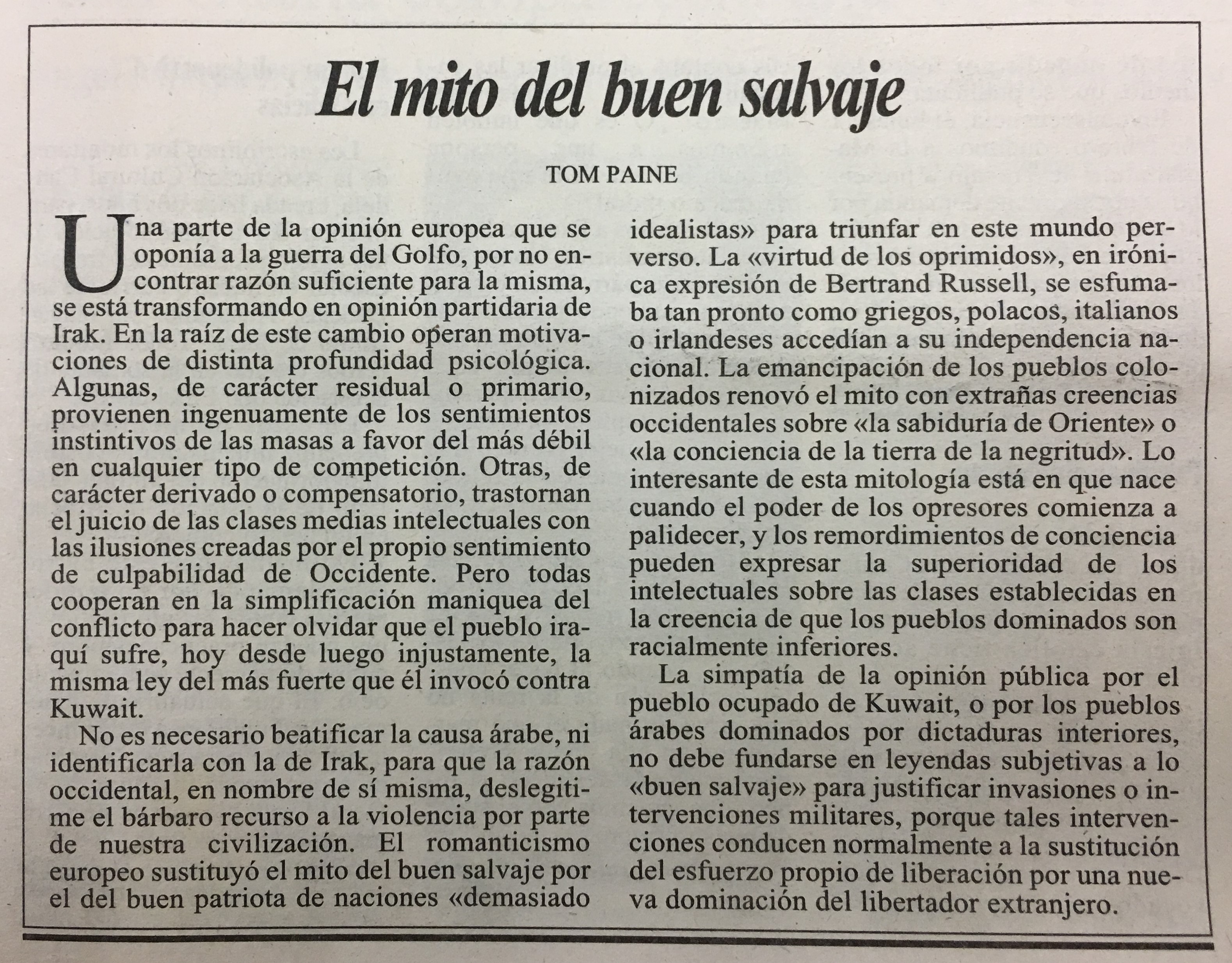 No es necesario beatificar la causa árabe, ni identificarla con la de Irak, para que la razón occidental, en nombre de sí misma, deslegiti me el bárbaro recurso a la violencia por parte de nuestra civilización. El romanticismo europeo sustituyó el mito del buen salvaje por el del buen patriota de naciones <demasiado