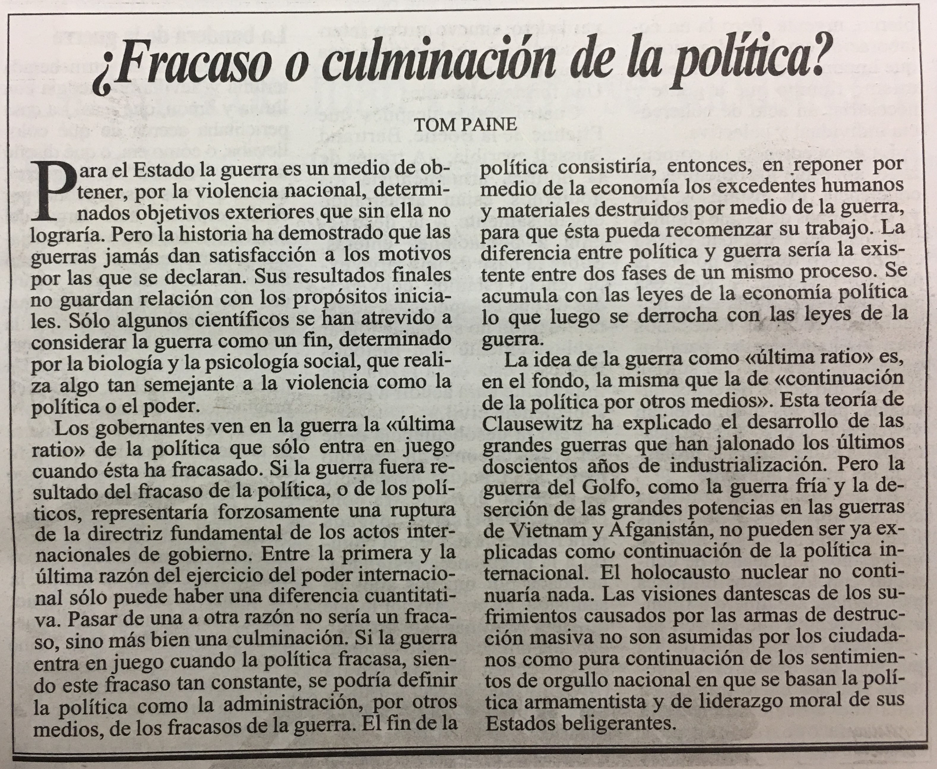 La idea de la guerra como <última ratio) es, en el fondo, la misma que la de <continuación de la política por otros mediosy. Esta teoría de Clausewitz ha explicado el desarrollo de las grandes guerras que han jalonado los últimos doscientos años de industrialización. Pero la guerra del Golfo, como la guerra fría y la deserción de las grandes potencias en las guerras de Vietnam y Afganistán; no pueden ser ya ex plicadas comc continuación de la política internacional: El holocausto nuclear no conti nuaría nada. Las visiones dantescas de los sufrimientos causados por las armas de destruc ción masiva no son asumidas por los ciudadanos como pura continuación de los sentimien tos de orgullo nacional en que se basan la tica armamentista y de liderazgo moral de sus Estados beligerantes. polí -