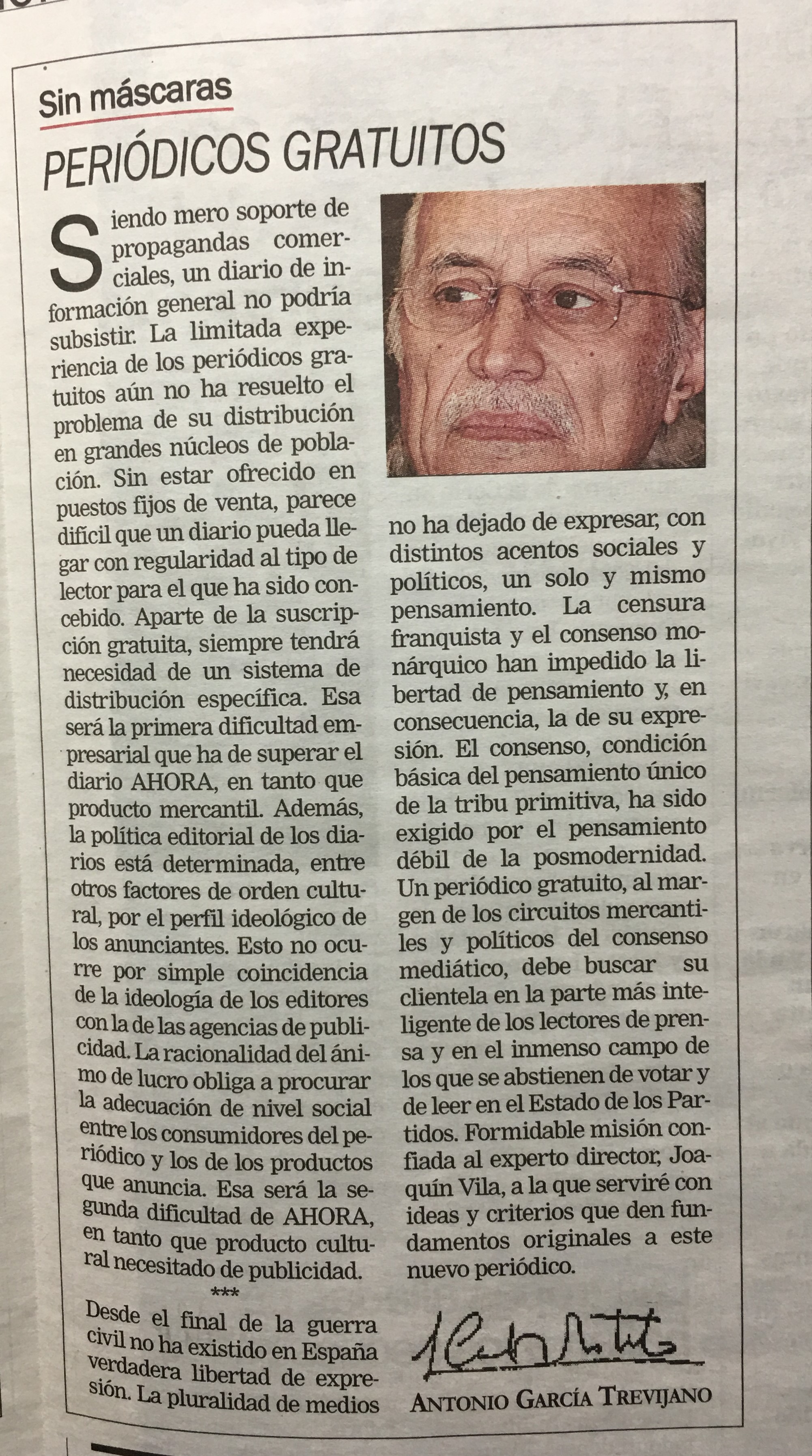 no ha dejado de expresar; con distintos acentos sociales y políticos; un solo y mismo pensamiento. La censura franquista y el consenso mo nárquico han impedido la libertad de pensamiento y en consecuencia, la de su expresión El consenso; condición básica del pensamiento único de la tribu primitiva, ha sido exigido por el pensamiento débil de la posmodernidad Un periódico gratuito; al margen de los circuitos mercantiles y políticos del consenso mediático; debe buscar clientela en la parte más inteligente de los lectores de prensa y en el inmenso campo de los que se abstienen de votar y deleer en el Estado de los Par tidos. Formidable misión confiada al experto director; JoaVila, a la que serviré con ideas y criterios que den fundamentos originales a este nuevo periódico quín