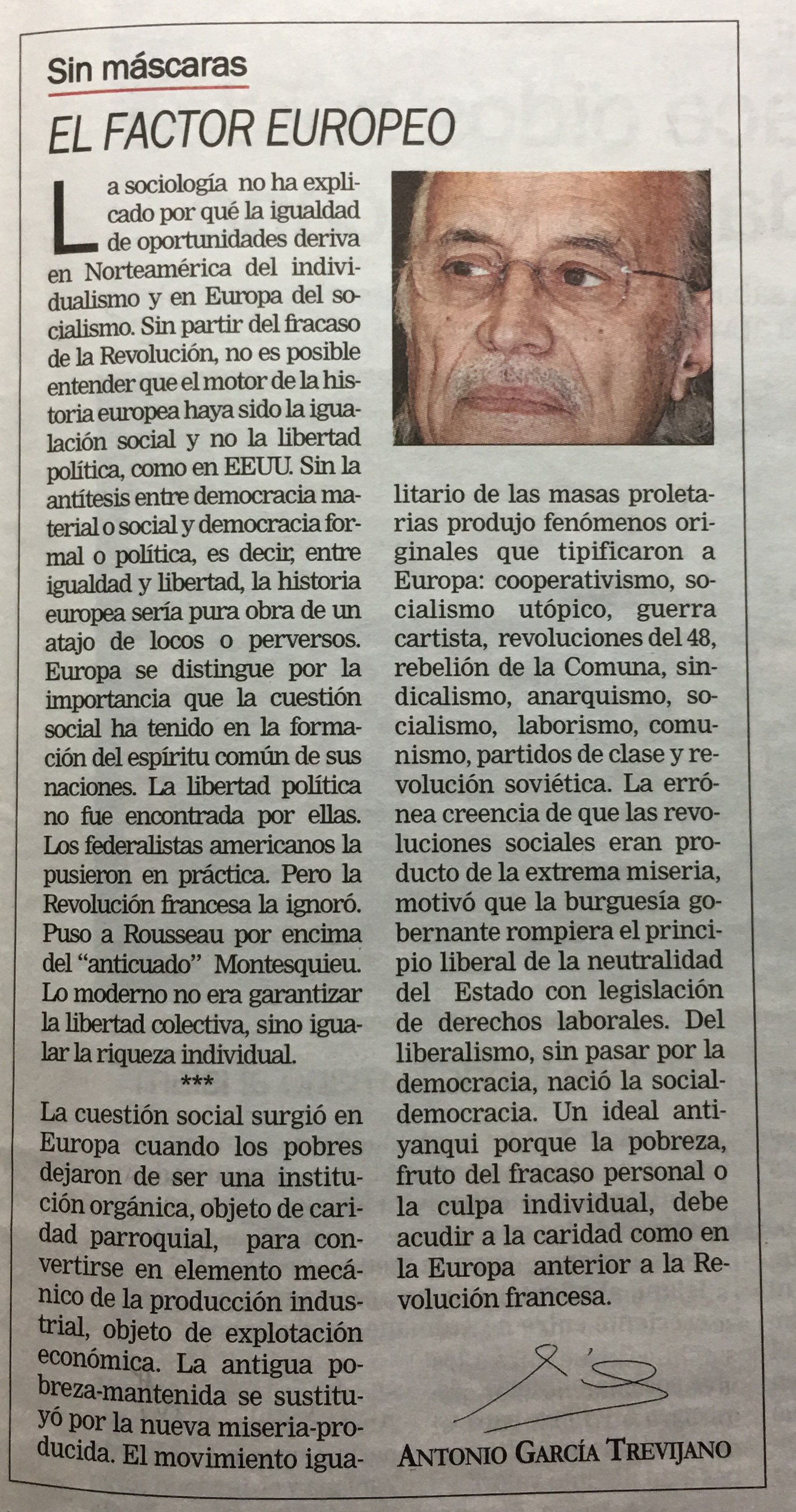 asociología no ha expliL cado por la igualdad de oportunidades deriva en Norteamérica del individualismo y en Europa del s0 cialismo. Sin partir del fracaso de la Revolución; no es posible entender queelmotor delahistoria europea haya sidola igualación social y política; como en EEUU Sin la antítesis entre democracia materialosocialy democraciafor mal 0 política; es decir; entre igualdad y libertad la historia europea sería pura obra de un atajo de locos 0 perversos. Europa se distingue por la importancia que la cuestión social ha tenido en Ja formación del espíritu común de sus naciones. La libertad política no fue encontrada por ellas. Los federalistas americanos Ja pusieron en práctica Pero Ja Revolución francesa Ja ignoró. Puso a Rousseau por encima del 'anticuado" Montesquieu Lo moderno no era garantizar la libertad colectiva, sino igualar lariqueza individual qué
