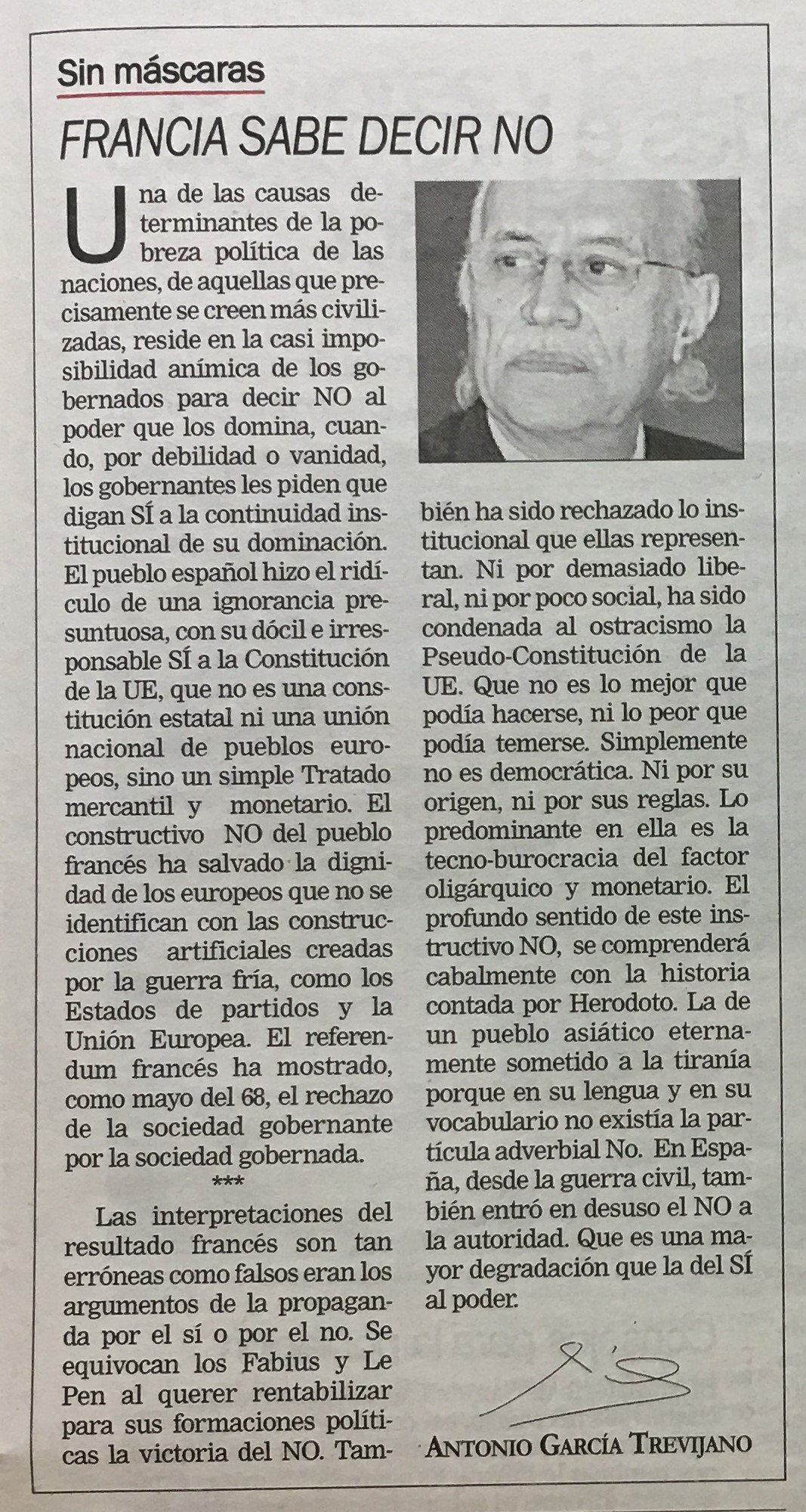 bién ha sido rechazado lo institucional que ellas representan. Ni por demasiado liberal, ni por poco social, ha sido condenada al ostracismo la Pseudo-Constitución de la UE. Que no es lo mejor que podía hacerse; ni lo peor que podía temerse: Simplemente no es democrática. Ni por su origen; ni por sus reglas. Lo predominante en ella es la tecno-burocracia del factor oligárquico y monetario. El profundo sentido de este instructivo NO, se comprenderá cabalmente con la historia contada por Herodoto. La de un pueblo asiático eternamente sometido a la tiranía porque en su lengua Y en su vocabulario no existía Ja par tícula adverbial No. En España, desde la guerra civil; también entró en desuso el NO a la autoridad. Que es una mayor degradación que la del SÉ al poder