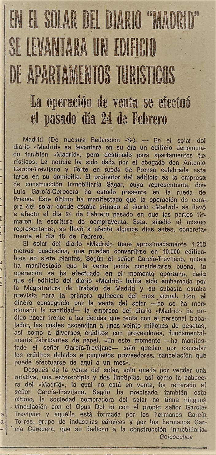 Madrid (De nuestra Redacción En el solar del se levantará en su día un edificio denominado tamblén aMadridm, destinado para apartamentos tus rísticos. La noticia ha sido dada por el abogado don Antonle García-Trevijano Forte en rueda de Prensa celebrada esta tarde en su domicilio. El promotor del edificlo de construcción inmobiliaria cuyo representante, don Luis García-Cerecera ha estado presente er la rueda de Prensa. Este último. ha manifestado que la operación de el 8 efecto 0/ día Febrero pasado en que las partes maron la escritura de compraventa. Esta, añadió el mismo representanter 80 Ilevó a inente el día 18 de Febrero pero Sagar , por vender una ra del la cual no está en venta, ha reiterado el señor García-Trevijano. Según ha precisado también este último, la socledad compradora del solar no tiene ninguná vínculación con el Del ni con el proplo señor GarcíaTrevijano aquélla está formada pOr los hermanos García Torres grupo de industrias cárnicas y los hermanos García Gerecera, que dedican 8 construcción Inraobiliaria: Opus