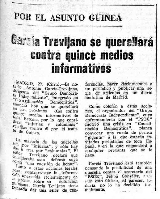a eslas irforma-' aparecida en sobre su actuación Garcfa Tevijano tiene dar una serie de Junto ción prcnsa guineana , Dcnsado de las querellas por injurias 0 tres Por calumnias El Trevijano declaró que csla defensa suya de honor son do , scior consideraba coino