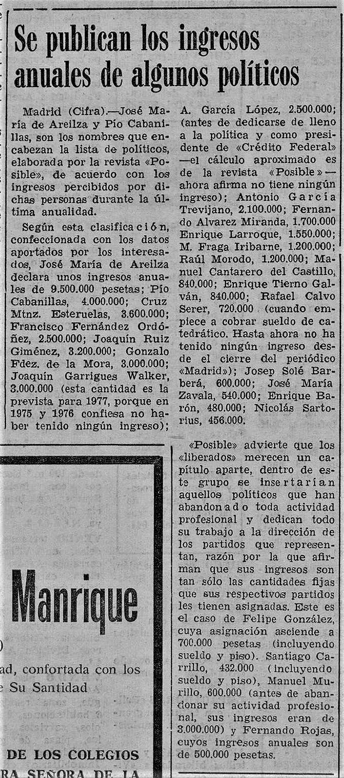 A García López; 2.500.000; (antes de dedicarse de lleno a la política y como presidente de <Crédito Federals el cálculo aproximado es de la revista & Posible > ahora afirma no tiene ningún ingreso) ; Antonio García Trevijano, 2.100.000; Fernando Alvarez Miranda; 1.700.000 Enrique Larroque; 1.550.000; M. Fraga Iribarne, 1.200,000; Raúl Morodo; 1.200.000; Manuel Cantarero del Castillo; 840.000; Enrique Tierno Galván, 840.000; Rafael Calvo Serer; 720.000 (cuando emplece a cobrar sueldo de catedrático. Hasta ahora no ha tenido ningún ingreso desde el cierre del periódico <Madrid)) ; Josep Solé Barberá, 600.000; José María Zavala, 540.000; Enrique Barón, Nicolás Sartorius, 456.000.